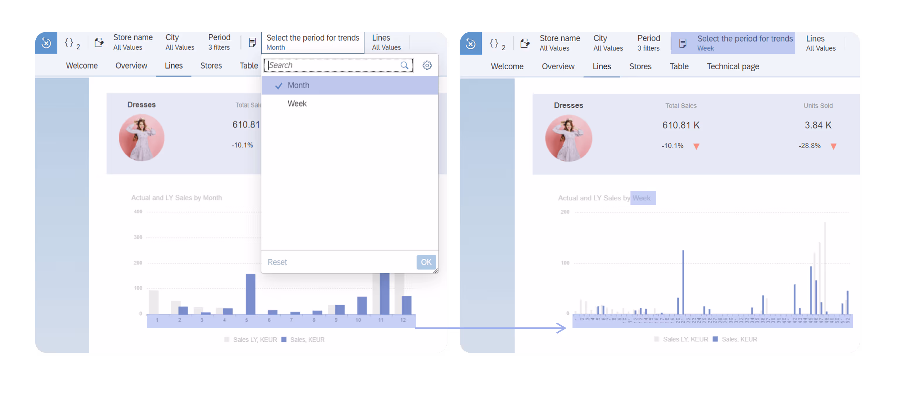 While switching between months and weeks is a common example, the flexibility of this functionality extends far beyond. It can be adapted to suit various use cases, such as toggling between product categories and individual products, regions and cities, or even fiscal years and quarters, depending on the specific analytical needs.
