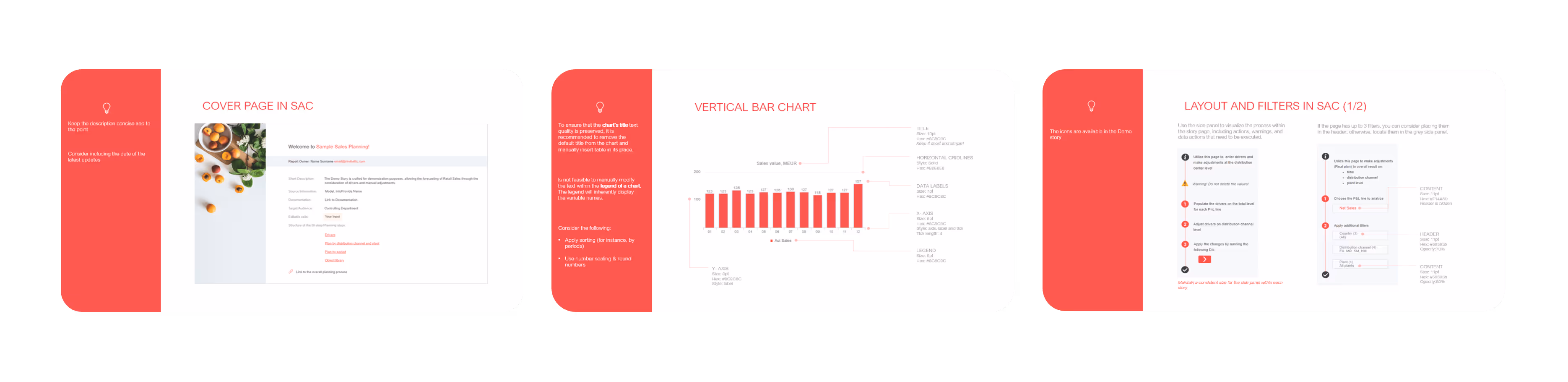 When we think about dashboards, one of the key initiatives implemented together with Rimi is the new reporting design guidelines, which encompass both SAP BO and SAC to provide users with consistent experience across different tools. These guidelines serve as a foundation to transform data into art. They include color palettes, optimal report structure and layout, report elements and visuals with predefined formatting, an icon library, and main naming principles. To streamline the self-service process and expedite report creation while ensuring adherence to the guidelines, templates are available in both tools, and icons are saved as shared elements in BO, making them easy and fast to reuse.