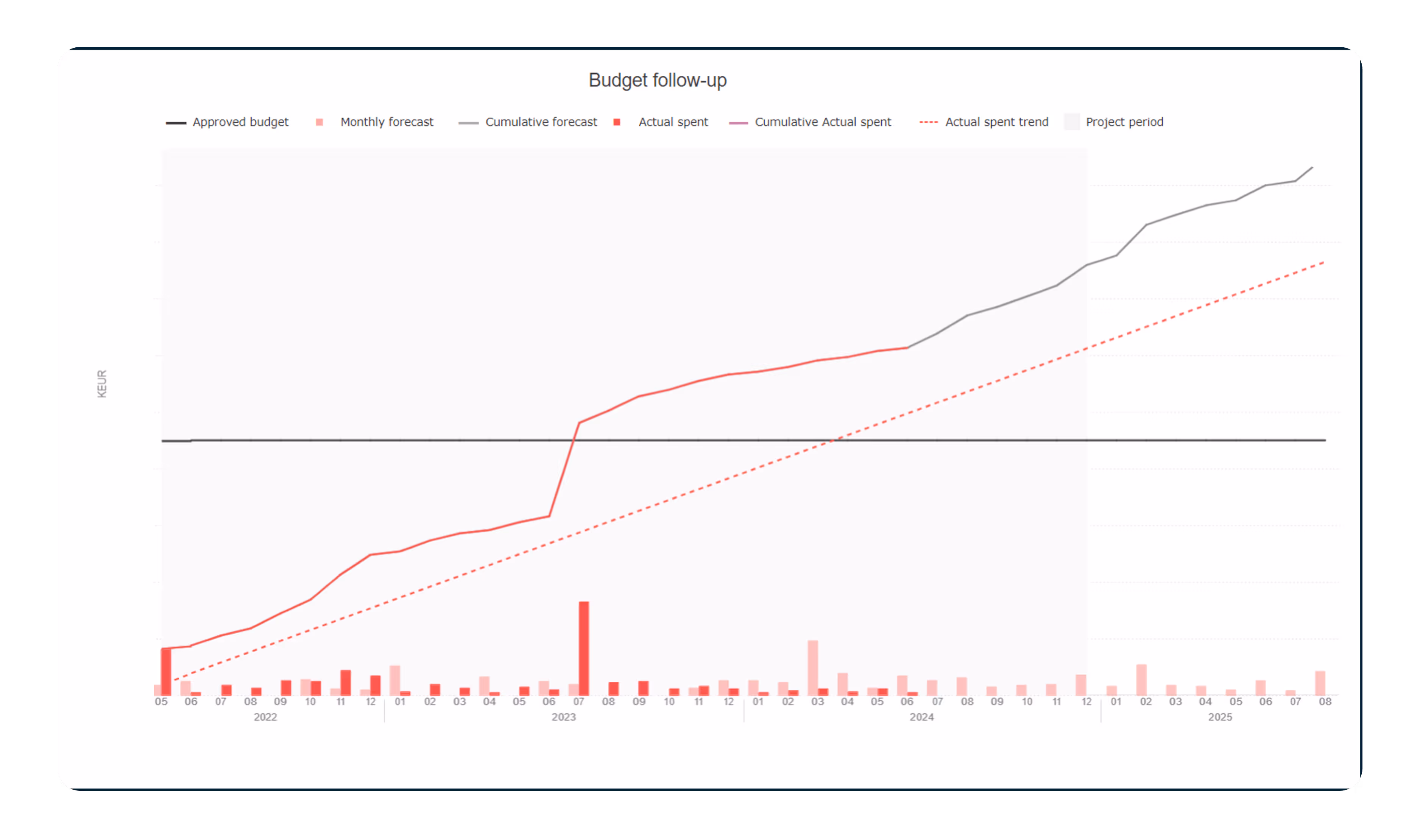 In the Project Management Office (PMO) dashboard we delve into project analysis, providing a robust tool for examining budgets, forecasts, and actual costs.
