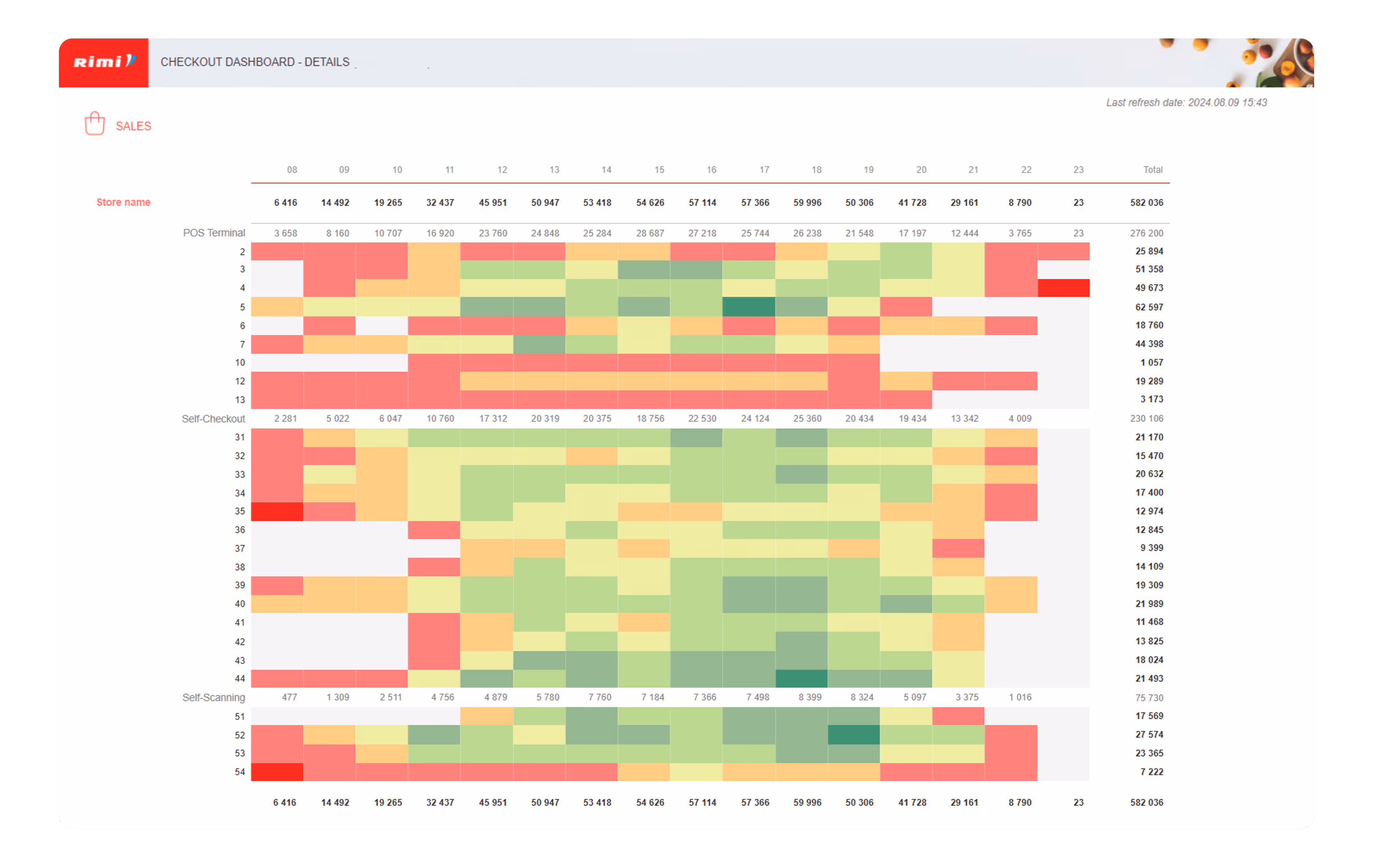 In the Checkout dashboard, the activity levels of the POS terminals within a store are analyzed. This evaluation helps understand the activity levels per working hour and identify peak usage times. Consequently, this information aids in making real-life decisions regarding the need for additional or fewer terminals within the store and adjusting the personnel schedule and store working hours.