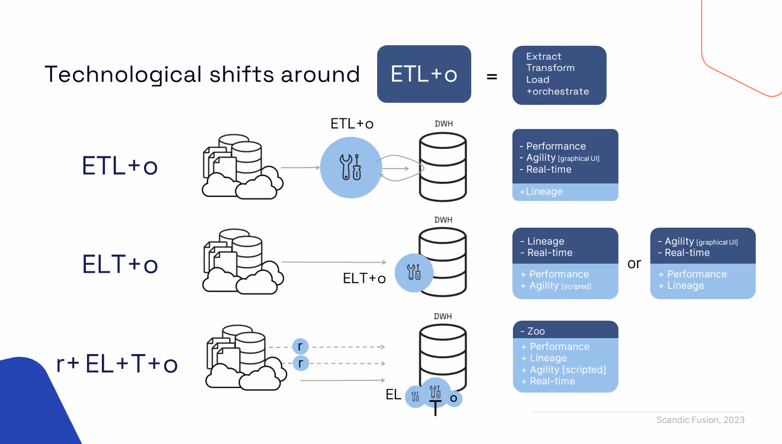 Many experts debate, why to choose ELT approach over ETL? If this question is still on your table, then we at Scandic Fusion believe the answer is straightforward for the past 10 years. We have been strong advocates of ELT approach as that has proven to be the most efficient way to transform data, taking advantage of modern data warehousing platforms, especially since the column-based & clustered database technologies became affordable. This belief automatically challenges how objective the market research companies are, because they rather focus on BIG names with primary focus on ETL as a standalone supplement to your DWH/BI ecosystem.