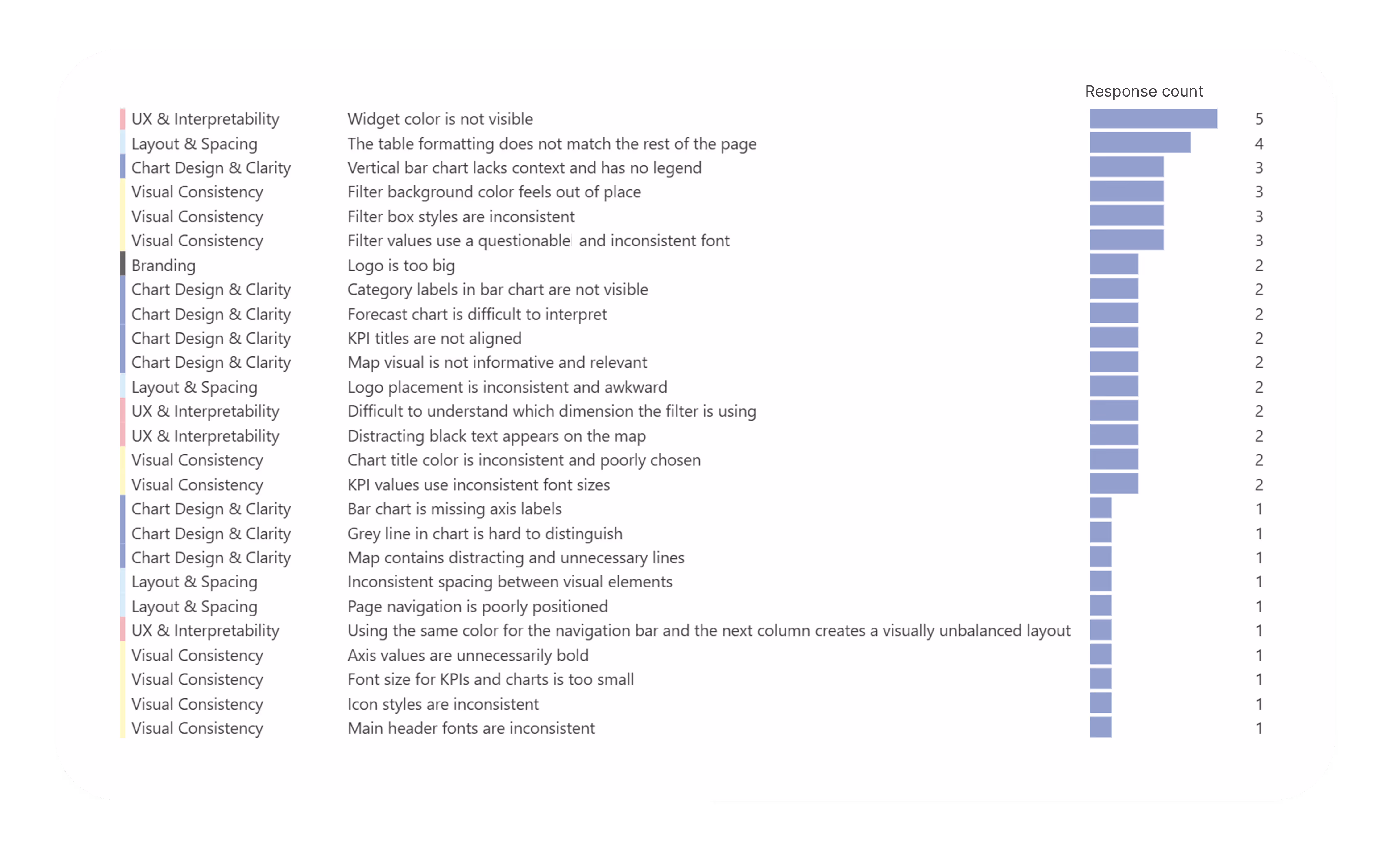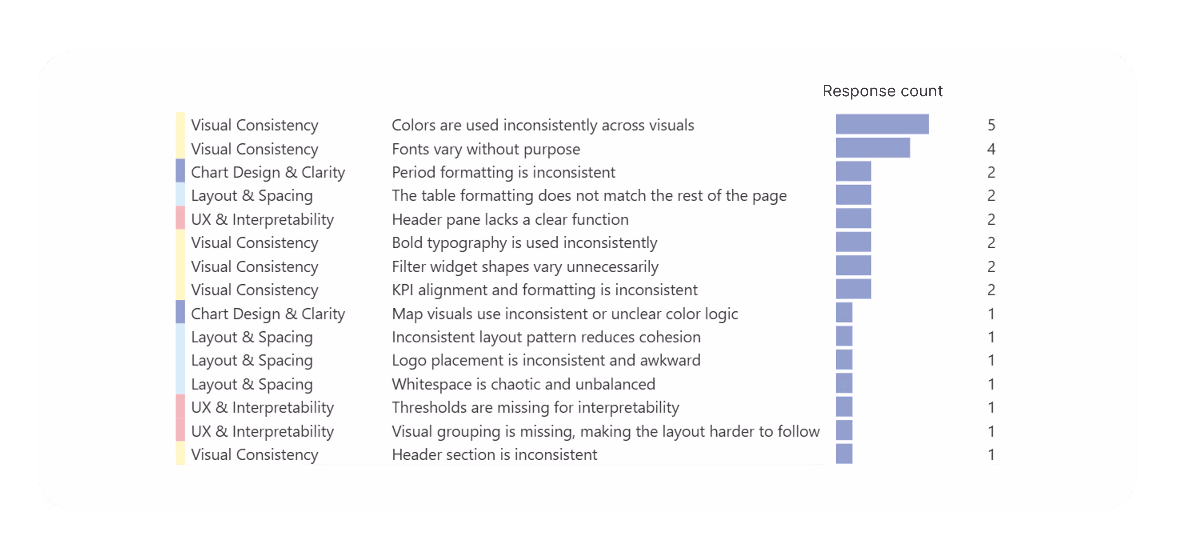 Common issues - like poor color contrast, inconsistent formatting, and mismatched filters - were frequently mentioned, yet each participant had their own perspective on what stood out most. This highlights that while some problems are clearly visible to everyone, others are more subjective and depend on individual perception.